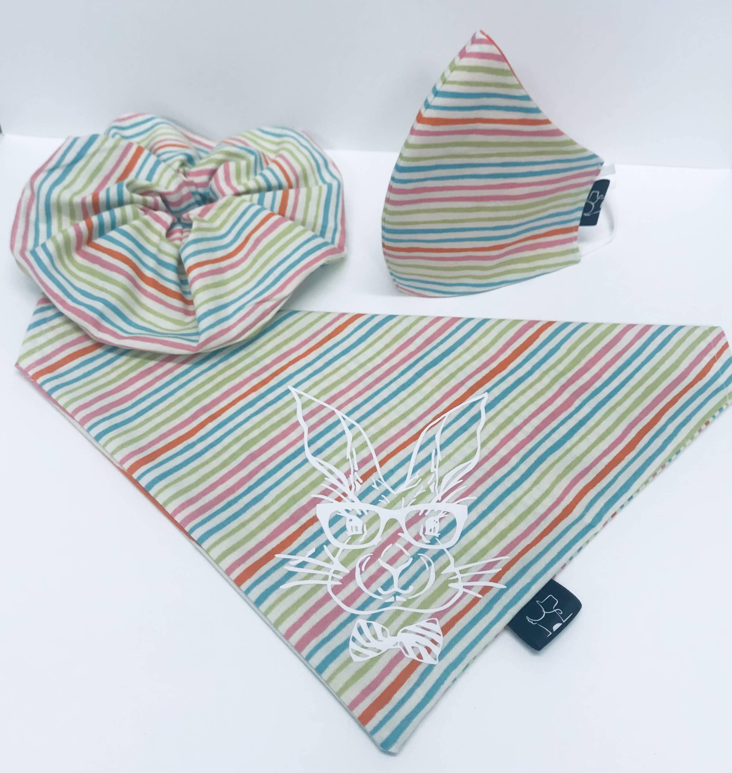 Paw Kingdom is a family business in Miami, FL. We design handmade bandanas for the King & Queen in your life. Since our bandanas are handmade design placement will vary on each bandana. This is a slip-on bandana (cover placed inside opening). Set includes 1 Bandana, 1 Scrunchie, 1 Face Mask.