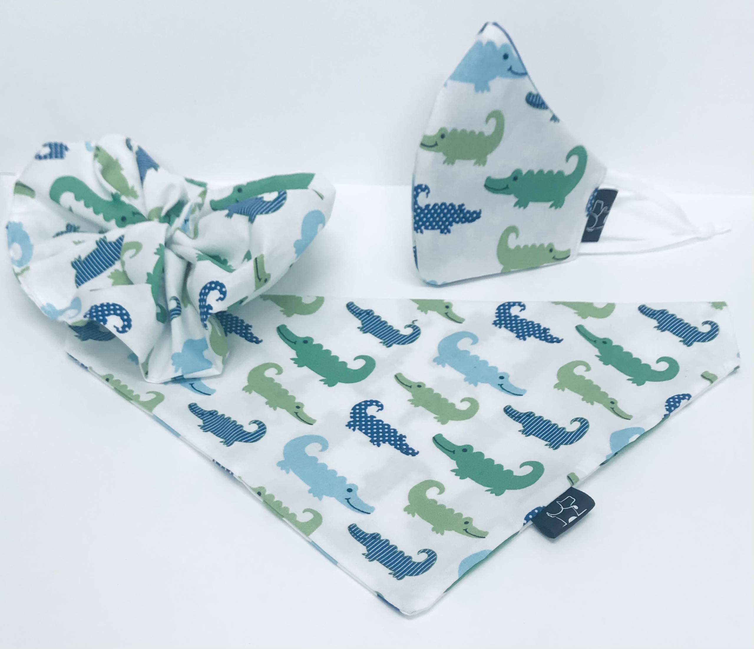 Paw Kingdom is a family business in Miami, FL. We design handmade bandanas for the King & Queen in your life. Since our bandanas are handmade design placement will vary on each bandana. This is a slip-on bandana (cover placed inside opening). Set includes: 1 Bandana, 1 matching Scrunchie and 1 matching Face Mask.