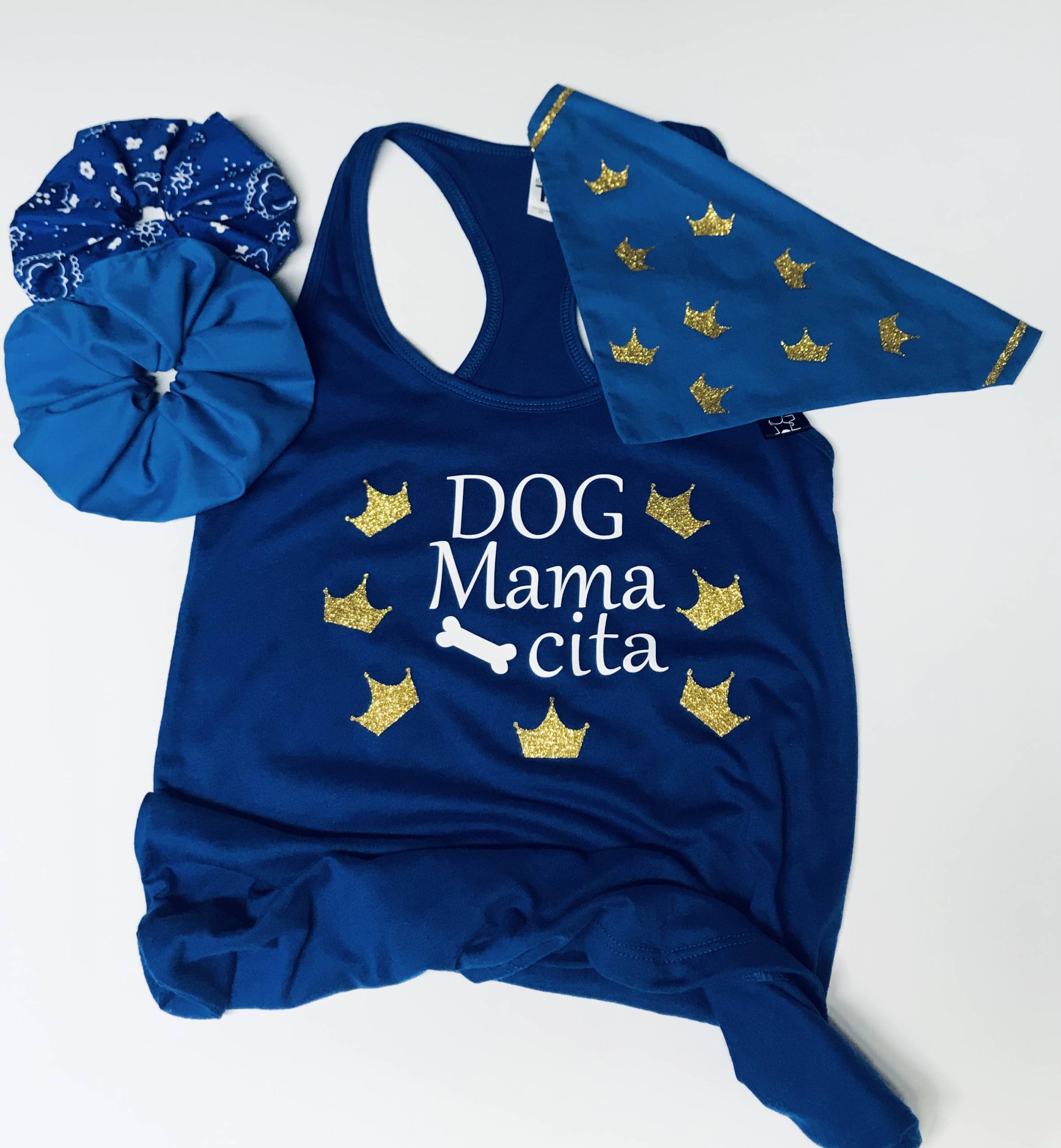 Paw Kingdom is a family business in Miami, FL. We design handmade bandanas for the King & Queen in your life. Since our bandanas are handmade design placement will vary on each bandana. This is tie-on bandana type. Set includes: 1 Racerback T-shirt, 2 Hair Scrunchies and 1 Dog Bandana.